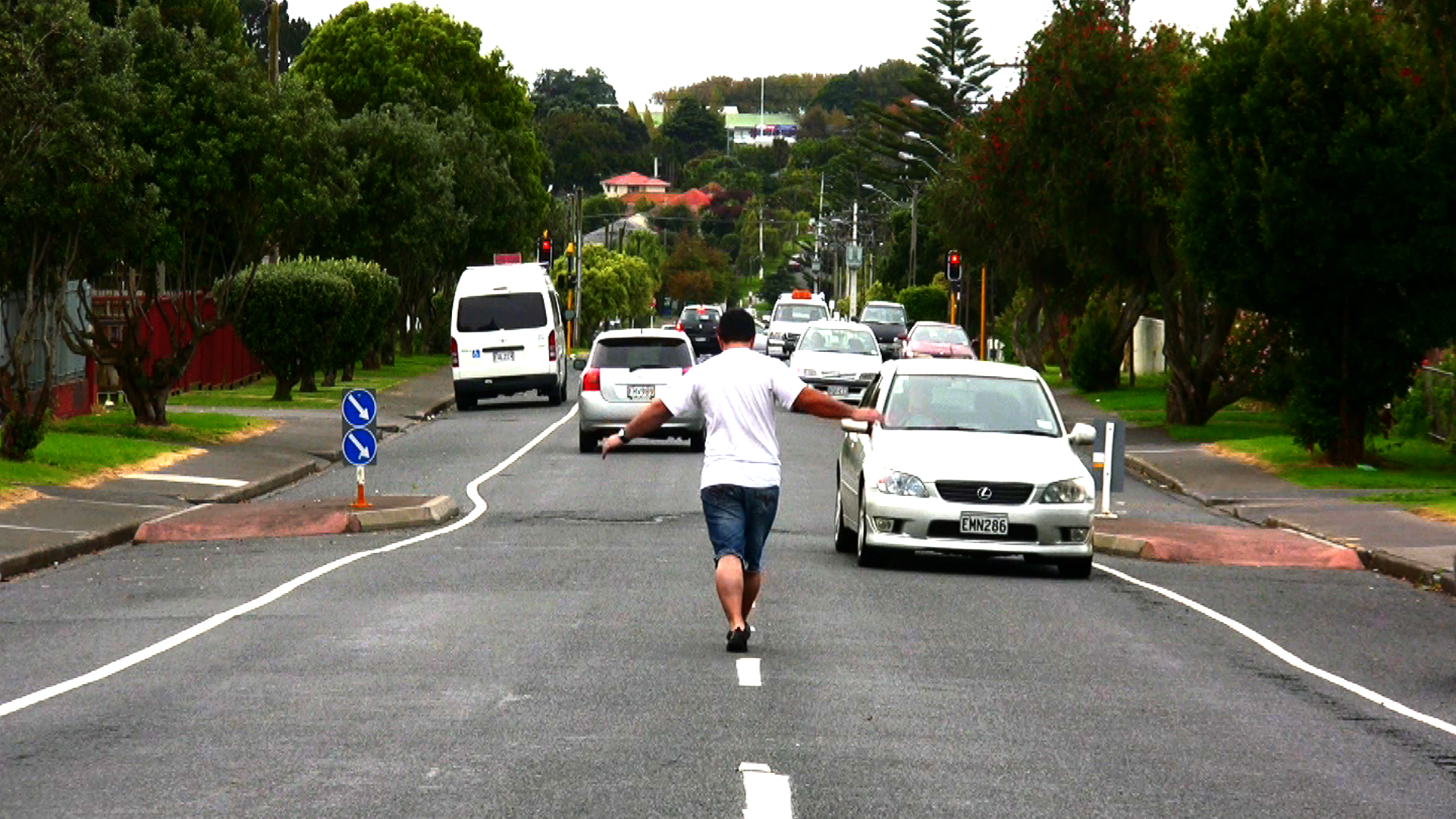Early video-documented performances helped establish Jeremy’s art practice and interest in site-specificity, performance art, and moving image. Works such as Public Observations II (2010), where market goers are forced to ebb and move around Jeremy while he sits at the centre of a bustling market, or Tight rope (2011), a documented performance of Jeremy walking tightrope style down the middle of a busy road with cars cautiously passing by. Other recent works include collaborative and participatory events such as Kawea (2019) and Earthpusher (2017), and navigating the space between narration, visual arts, and film with works such as Mai i te kei o te waka ki te ihu o te waka (2018) and When the moon sees the sun (2019).